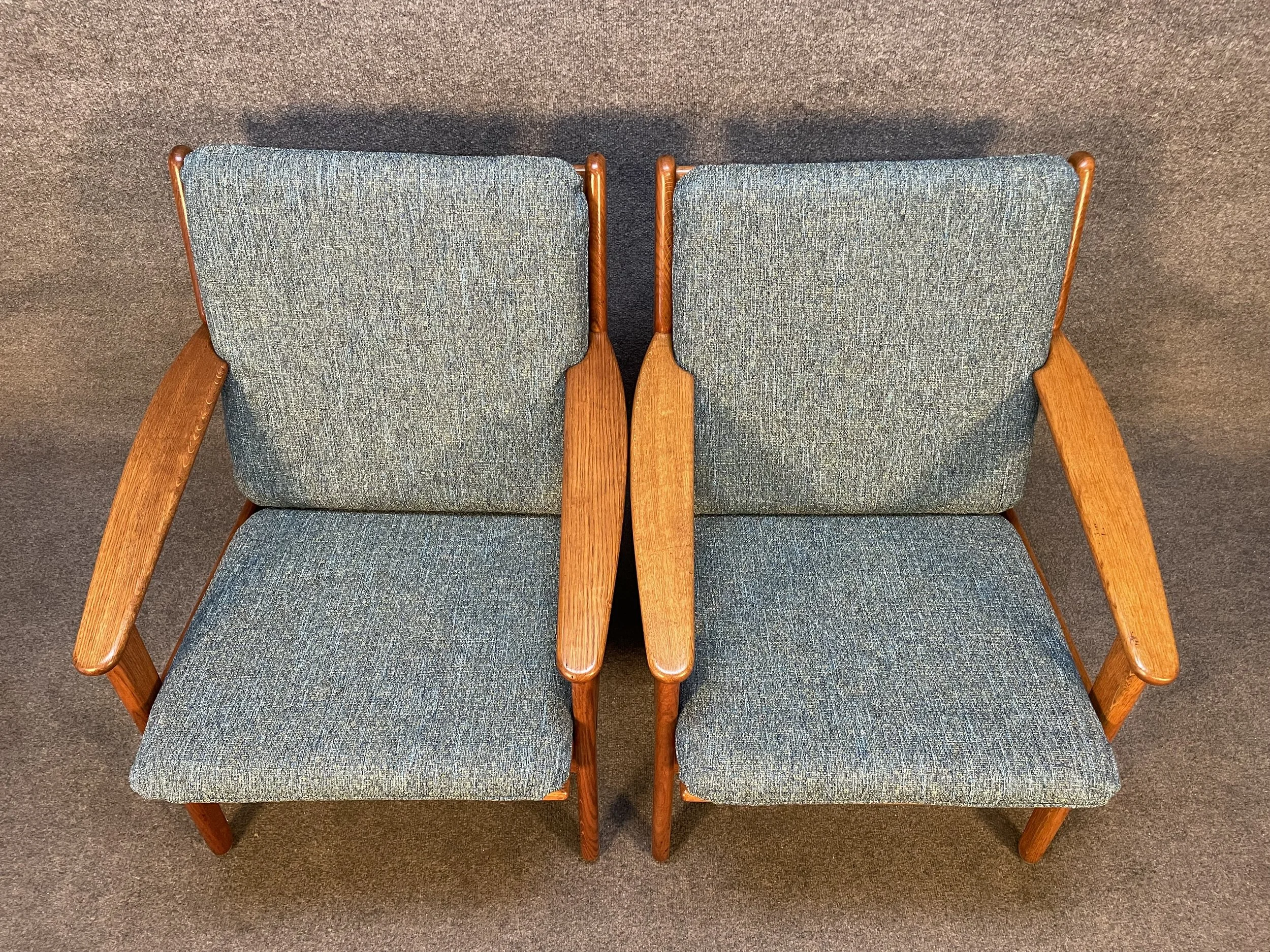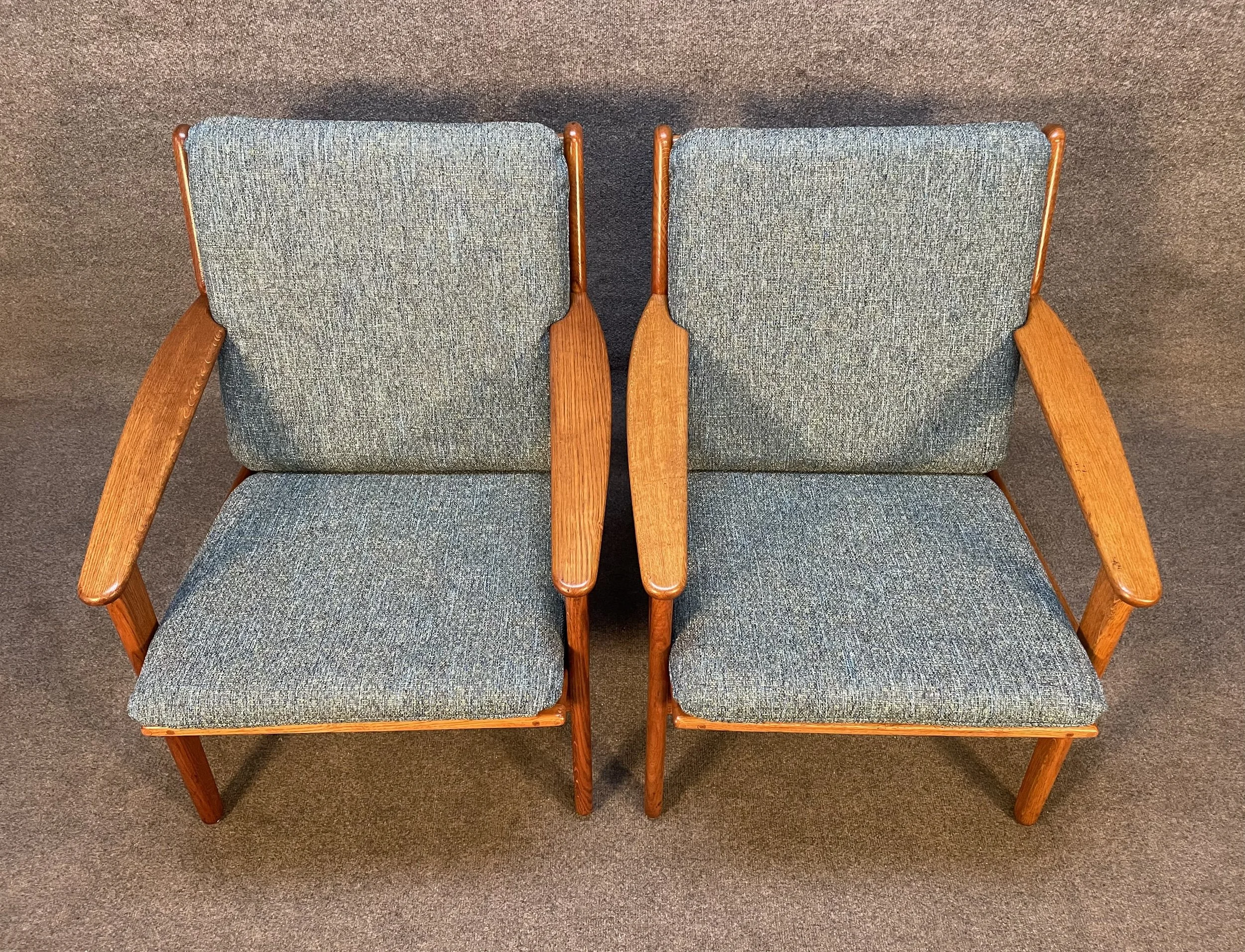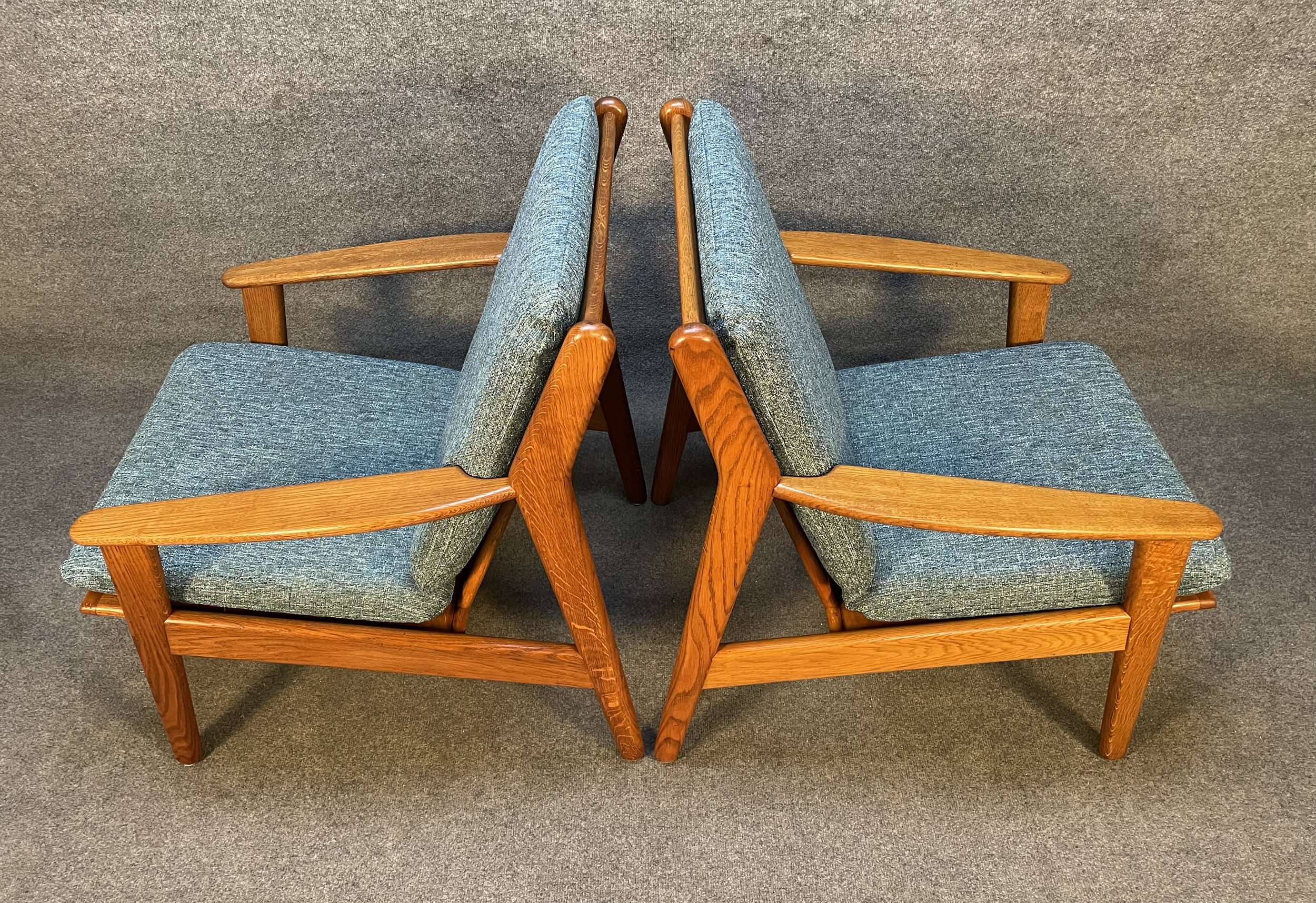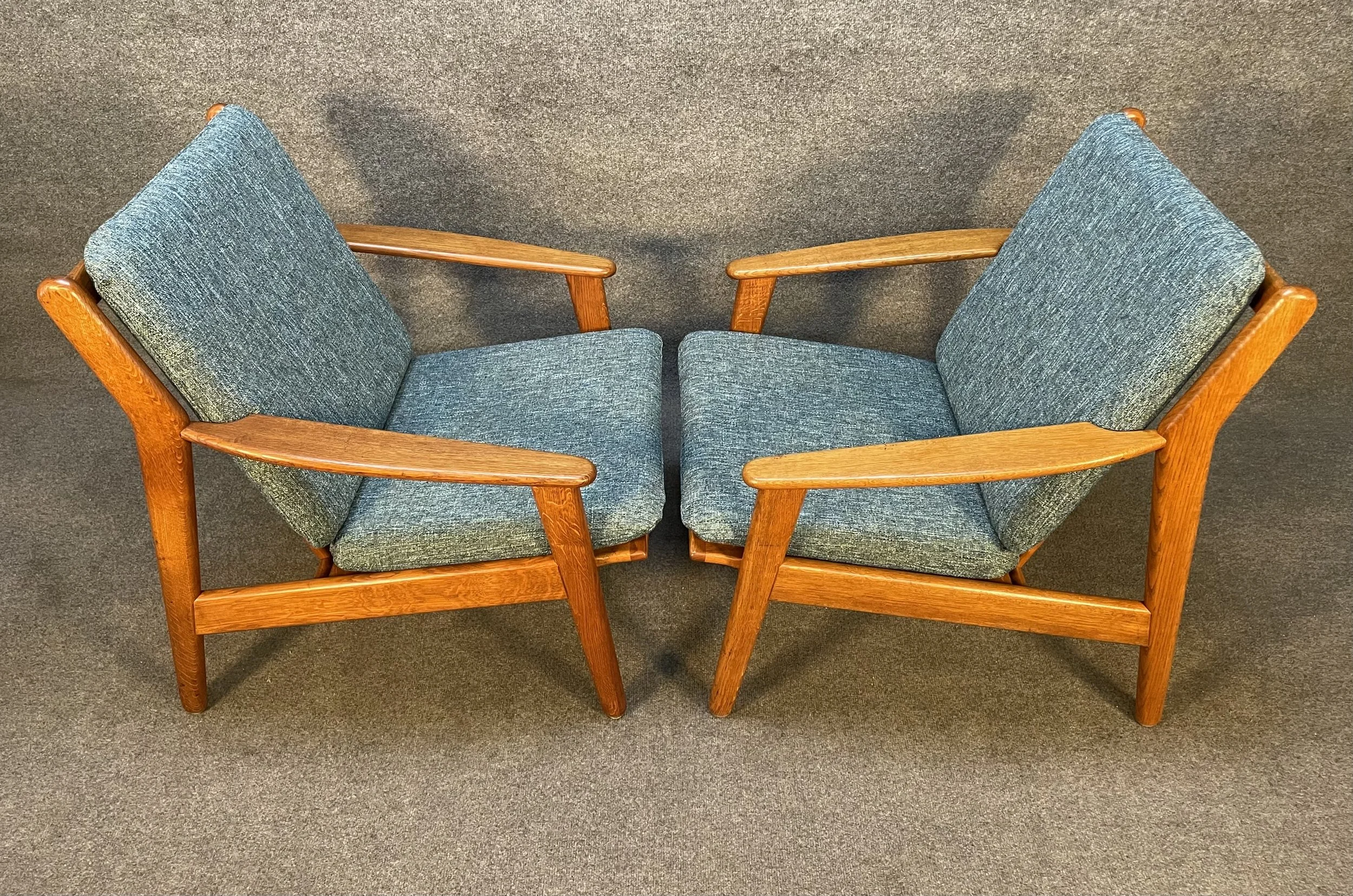Here is beautiful set of two vintage scandinavian modern lounge chairs in oak model "J55" designed by Poul Volther and manufactured by FDB Mobler in Denmark in the 1960's.
