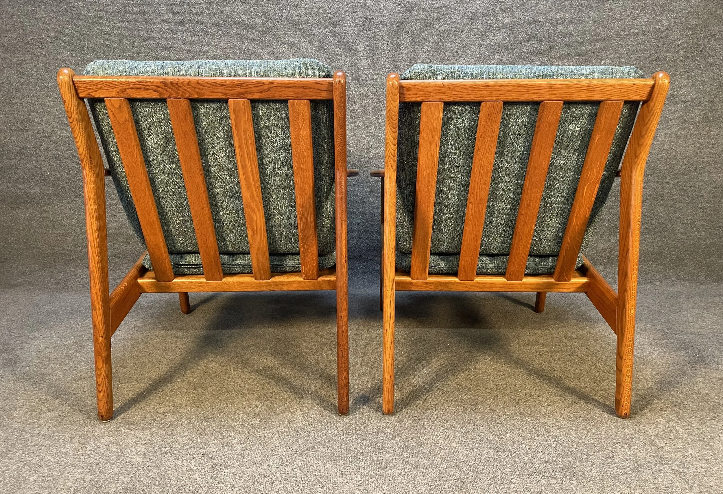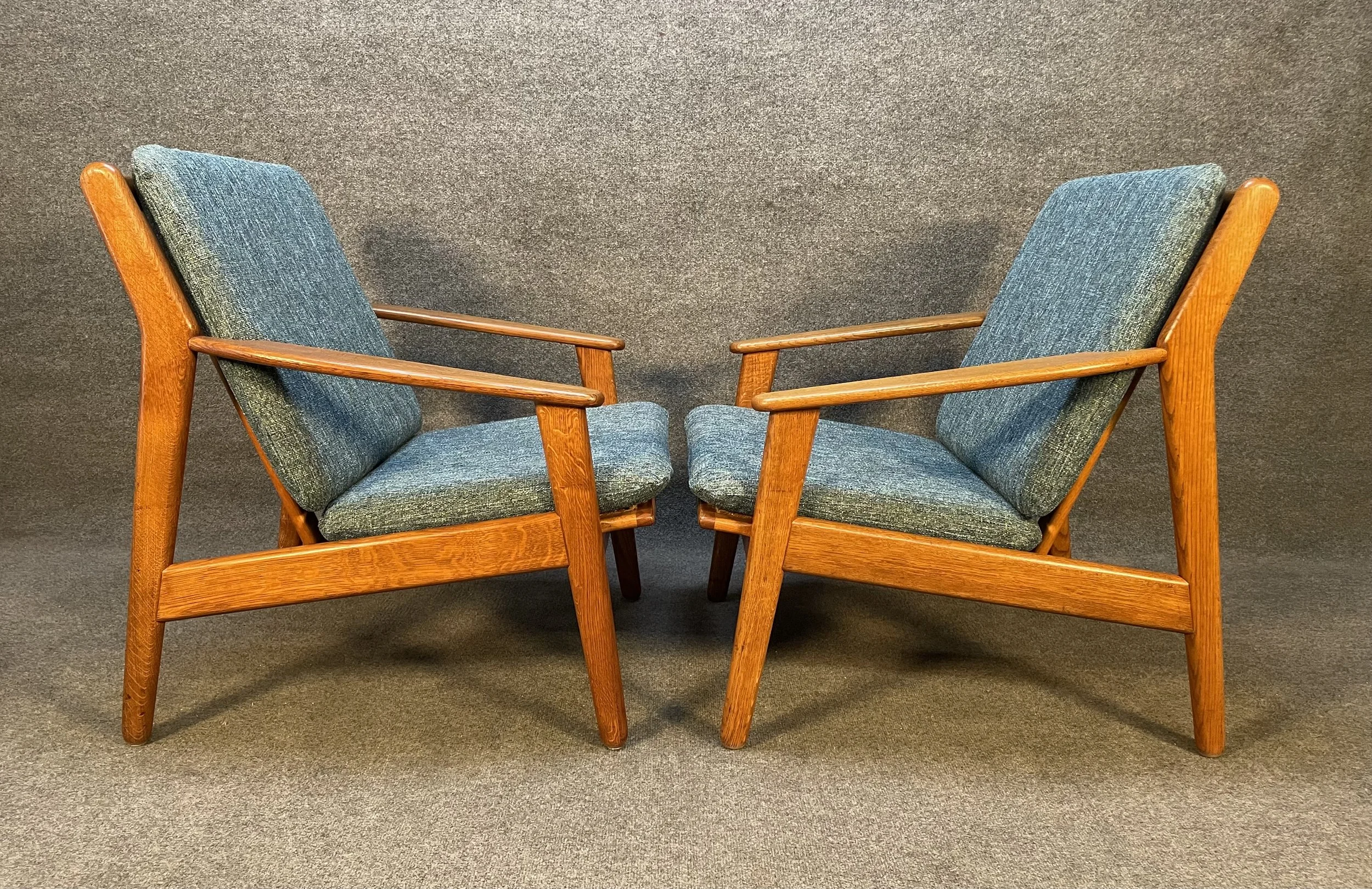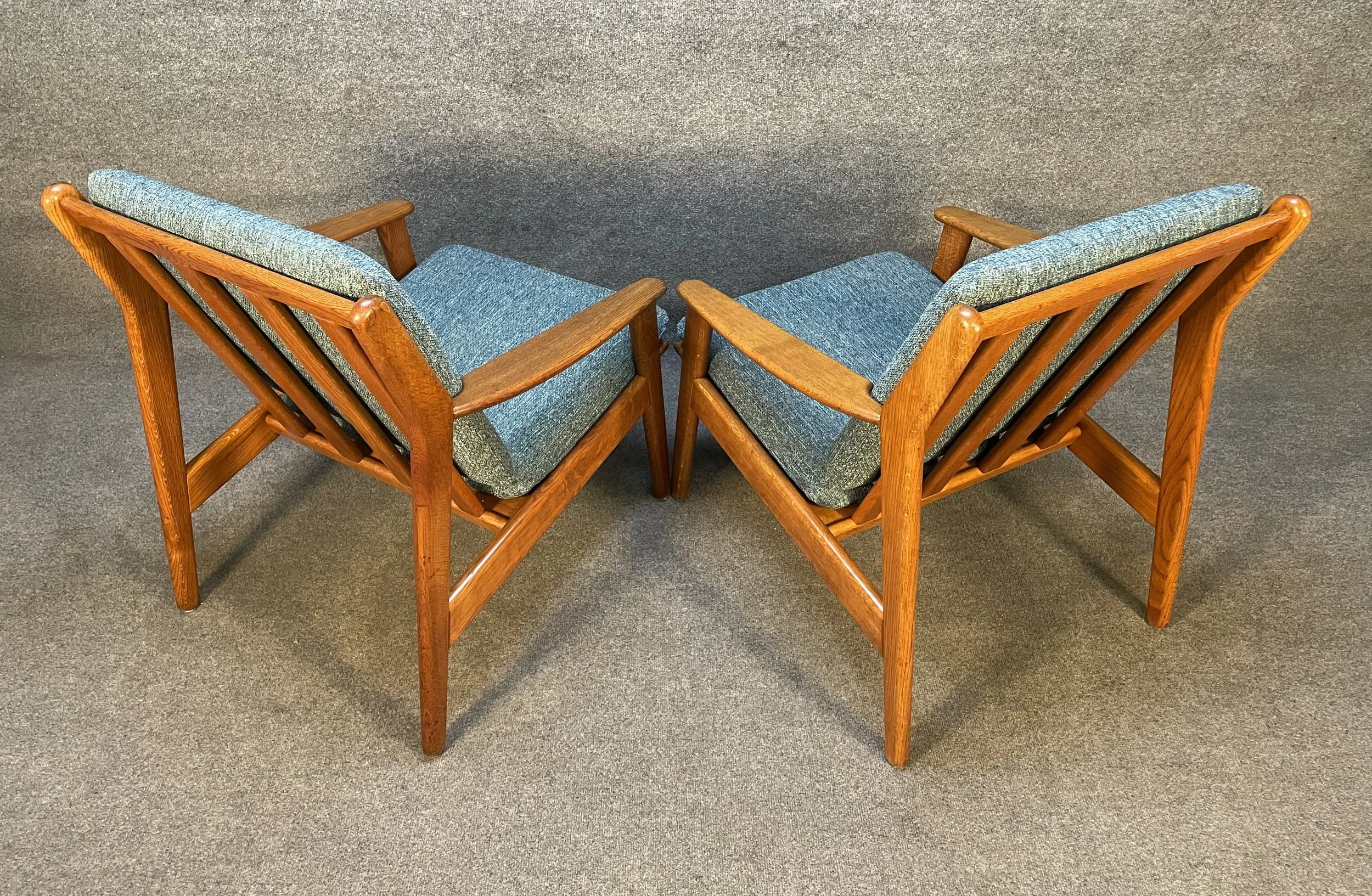 Here is beautiful set of two vintage scandinavian modern lounge chairs in oak model "J55" designed by Poul Volther and manufactured by FDB Mobler in Denmark in the 1960's.