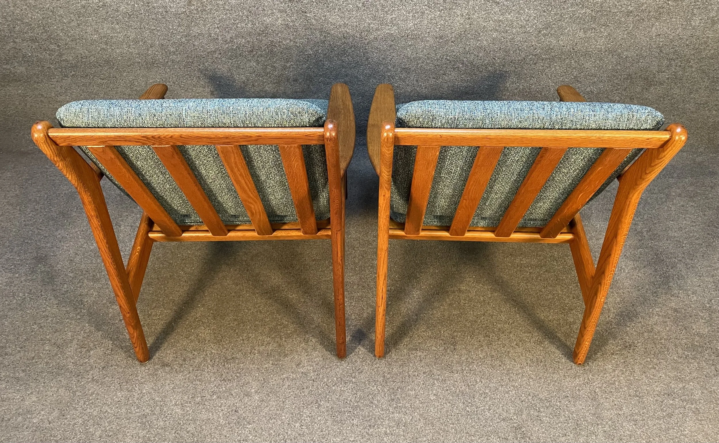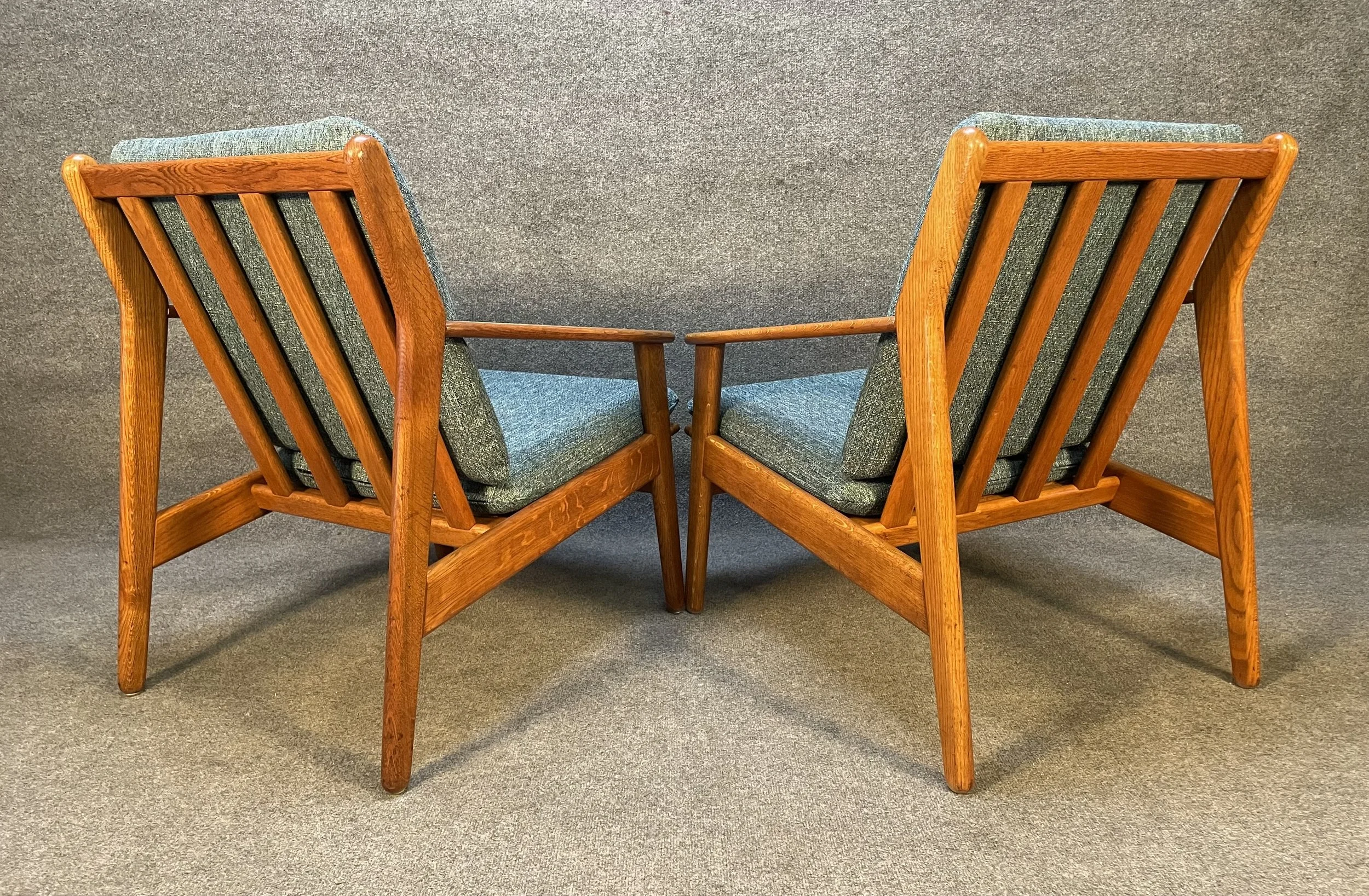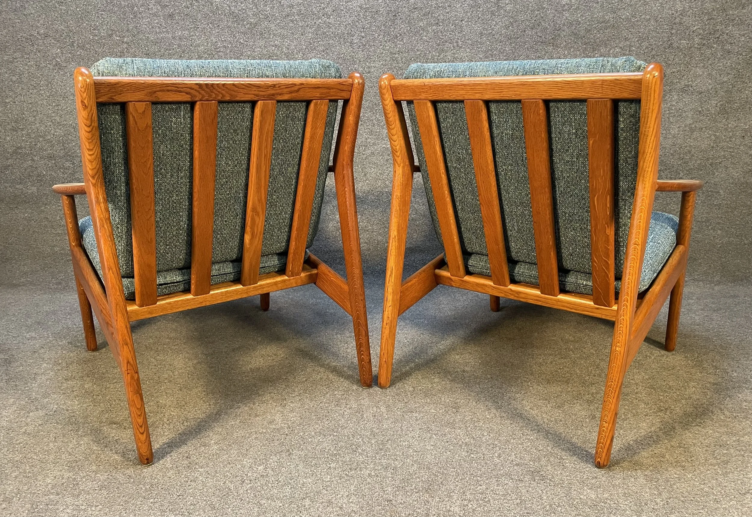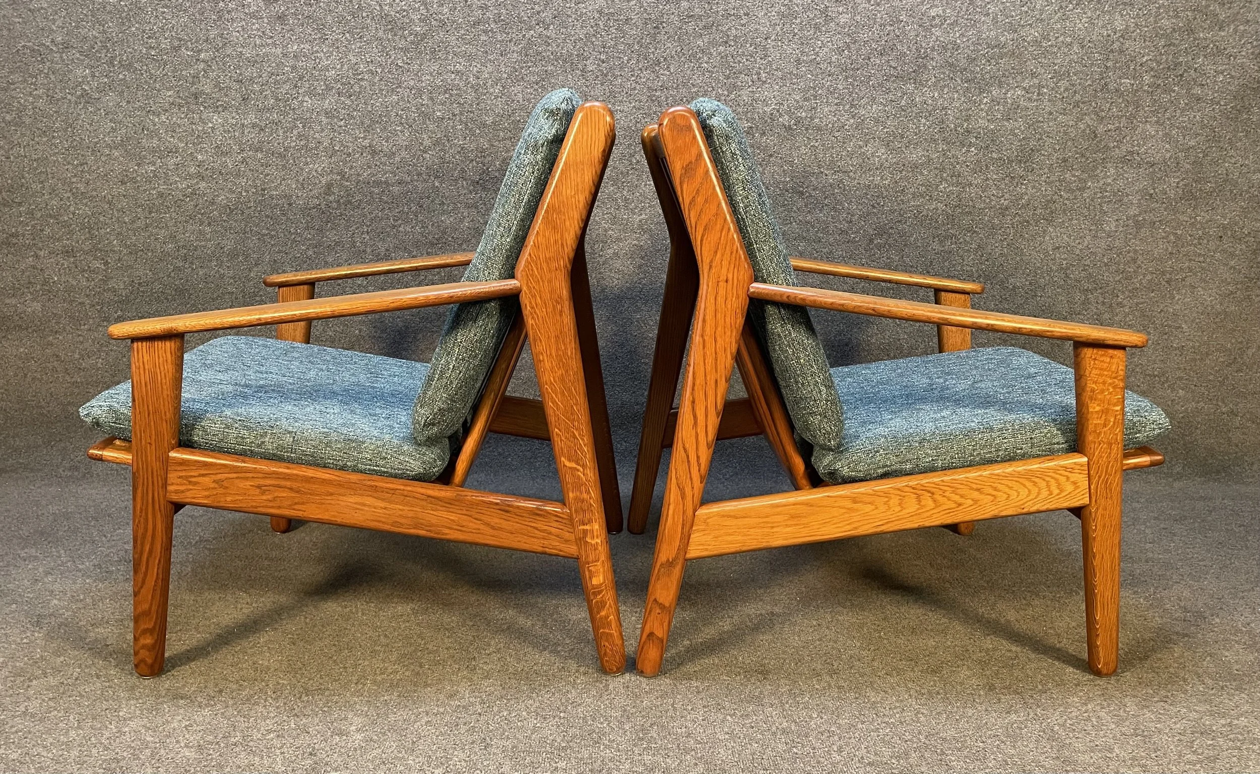 Here is beautiful set of two vintage scandinavian modern lounge chairs in oak model "J55" designed by Poul Volther and manufactured by FDB Mobler in Denmark in the 1960's.