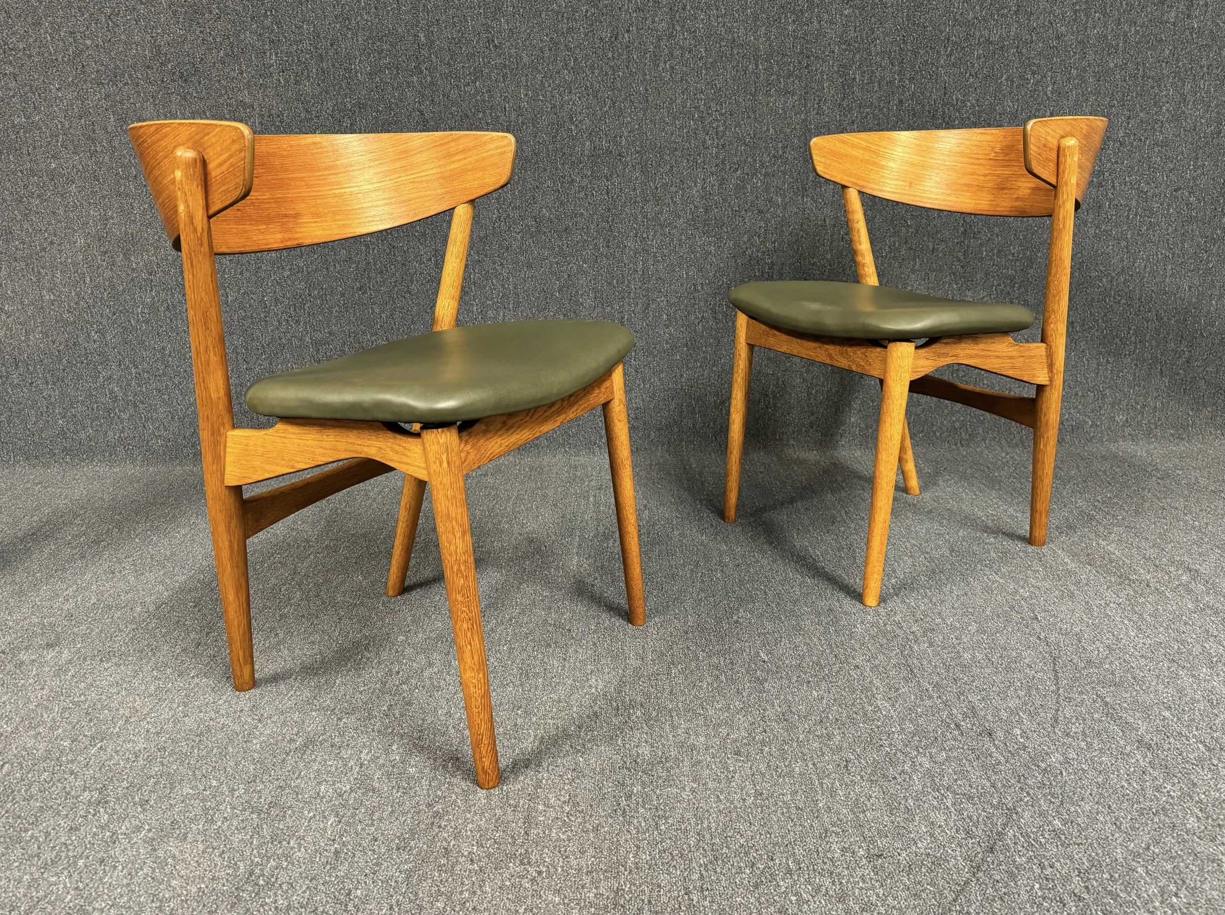 Here is beautiful pair of scandinavian modern side-dining chairs in teak and oak designed and manufactured by Helge Sibast in Denmark in 1953.