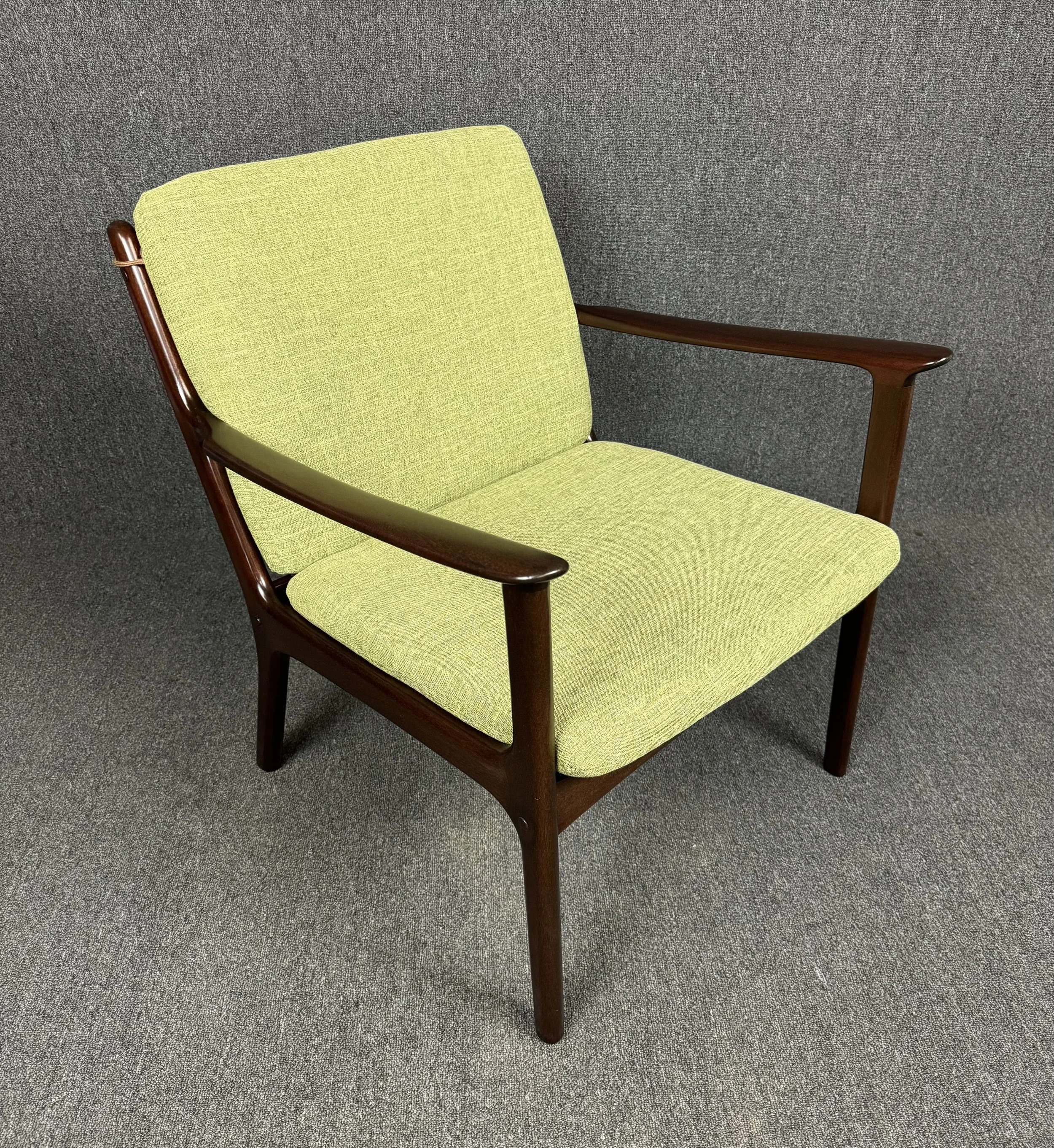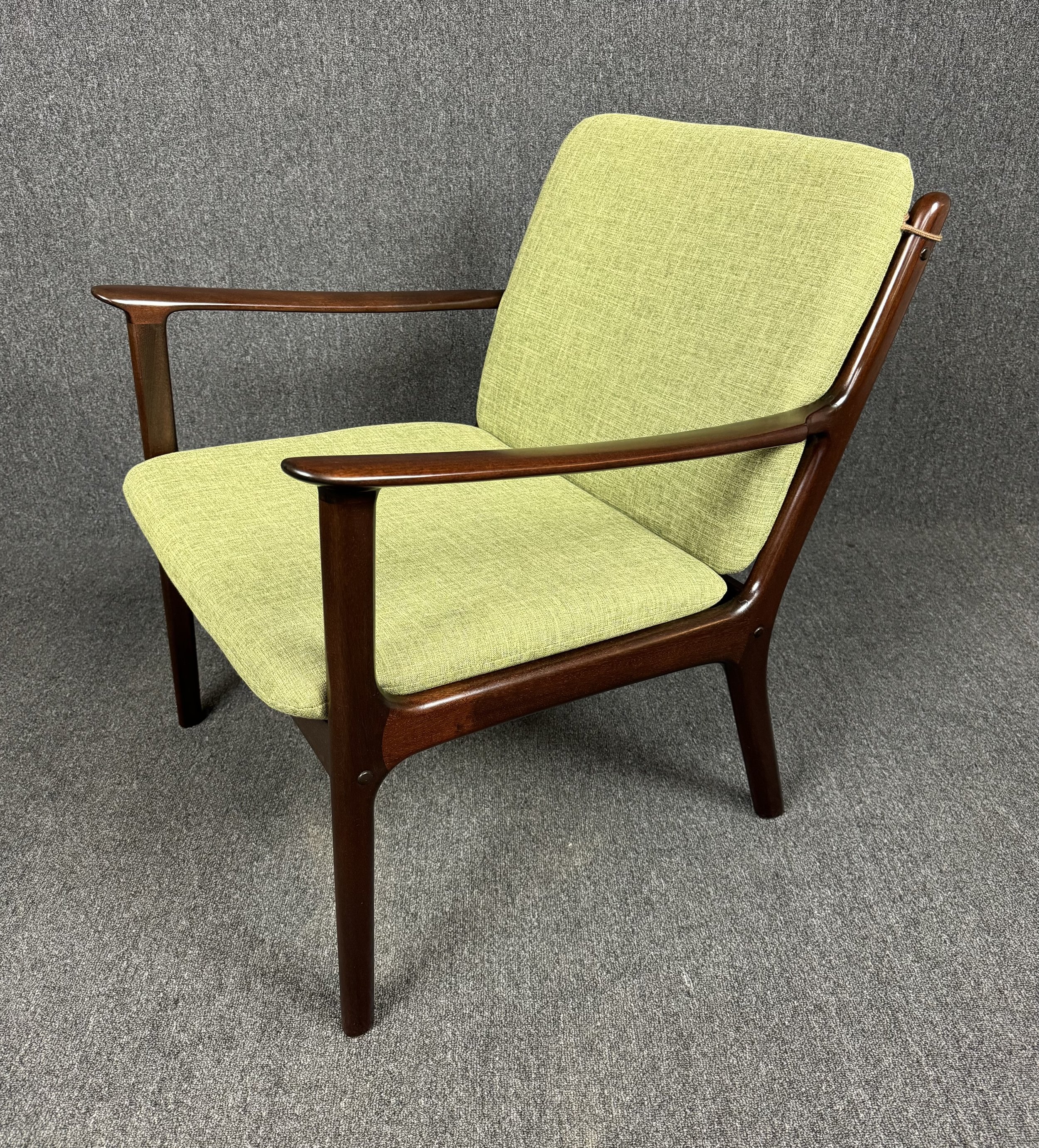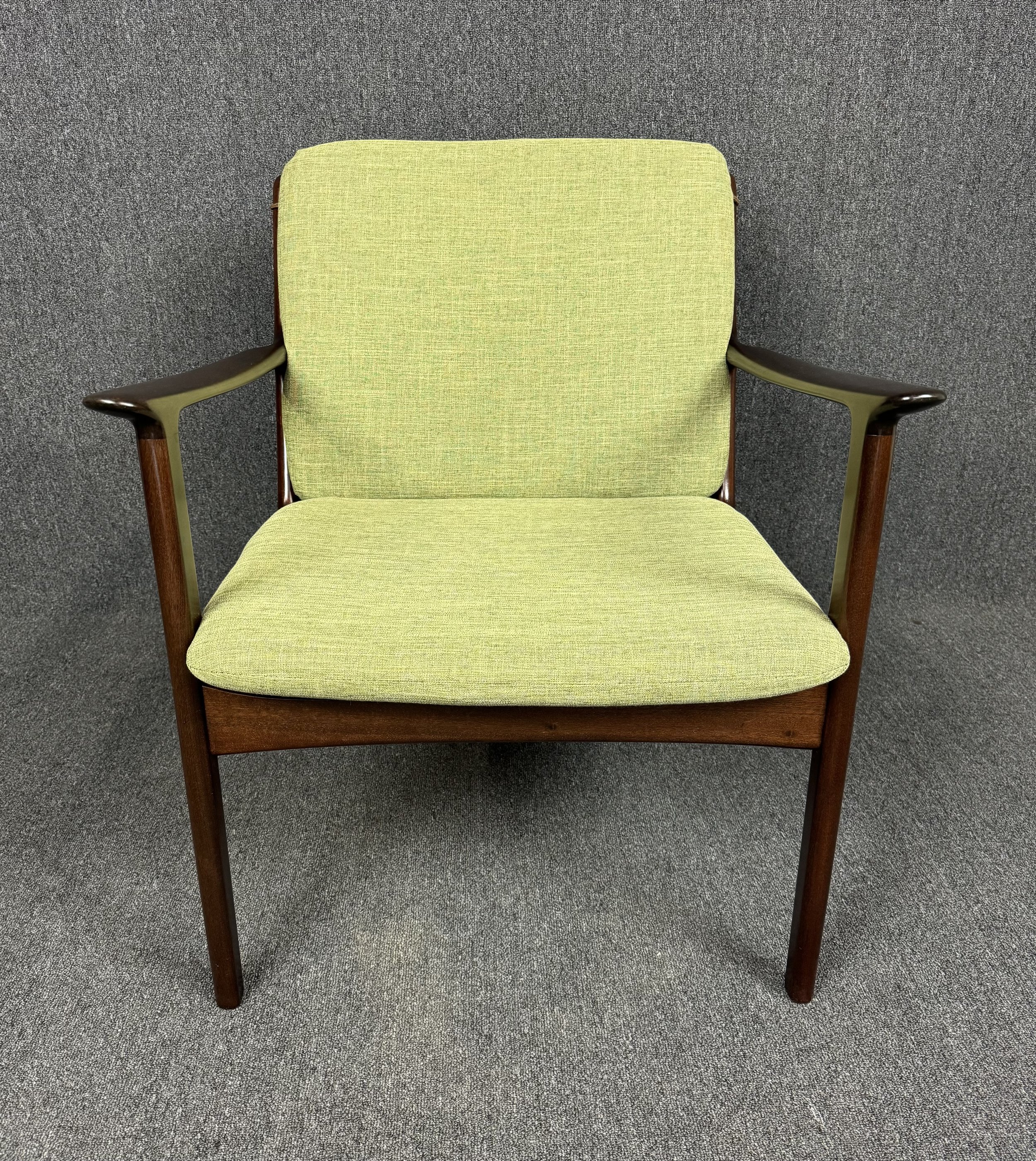 Here is beautiful Scandinavian easy chair Model PJ112 in mahogany designed by professor Ole Wanscher and manufactured by Poul Jeppesen in Denmark in the 1960s. This comfortable chair, recently imported from Copenhagen to California before its refinishing, feature a sculptural frame in solid mahogany, new foam cushions and new upholstery in contrasting period correct textured fabric in green chartreuse.