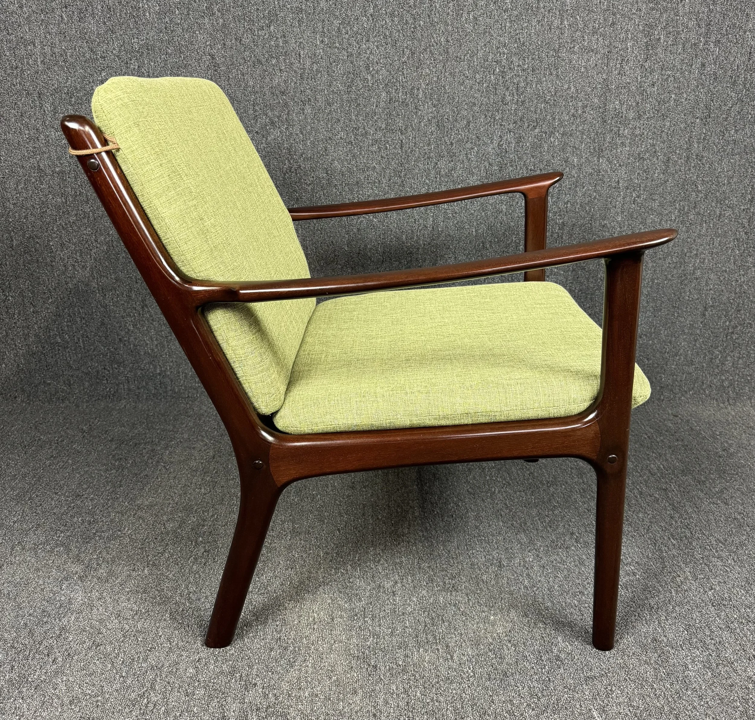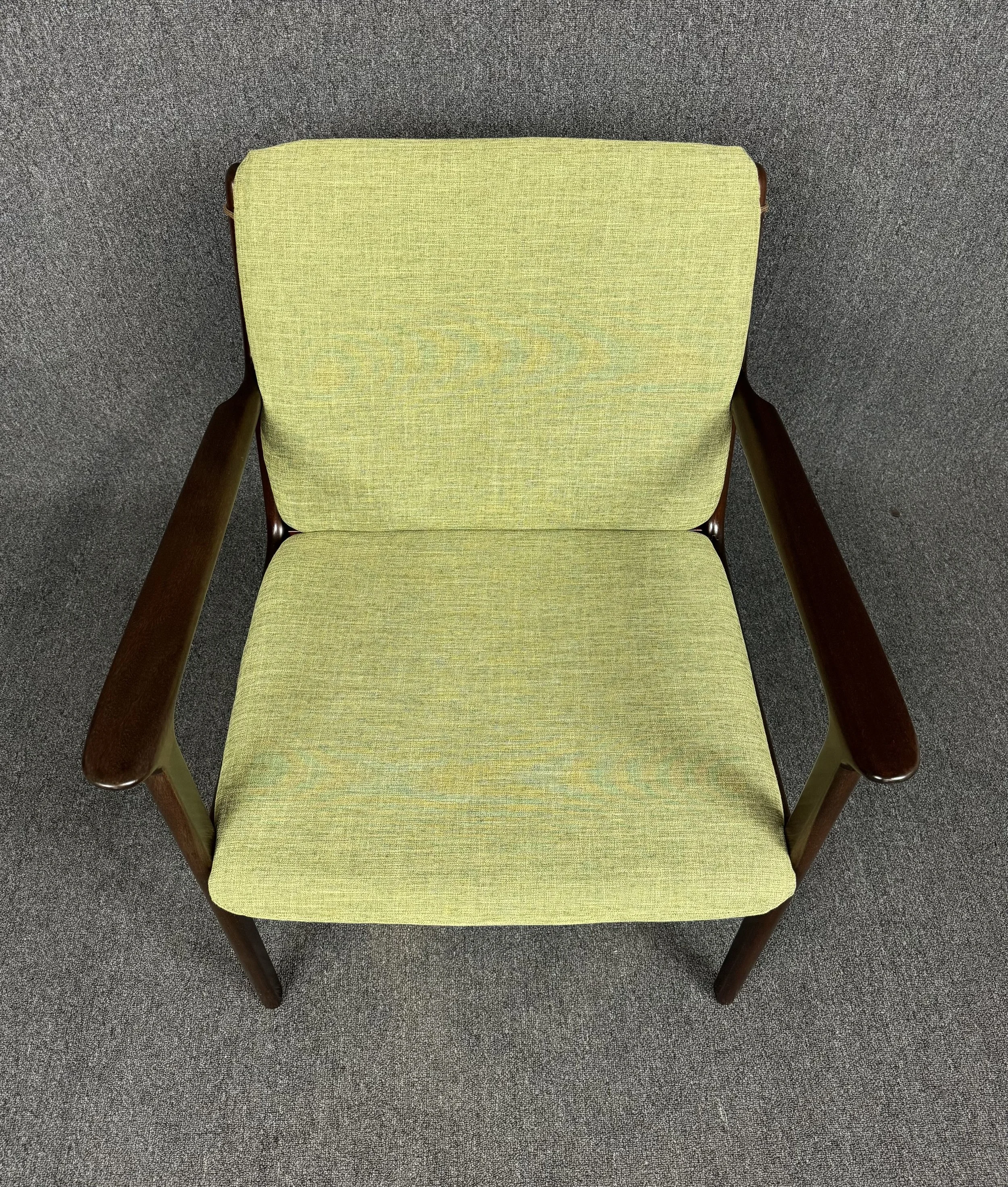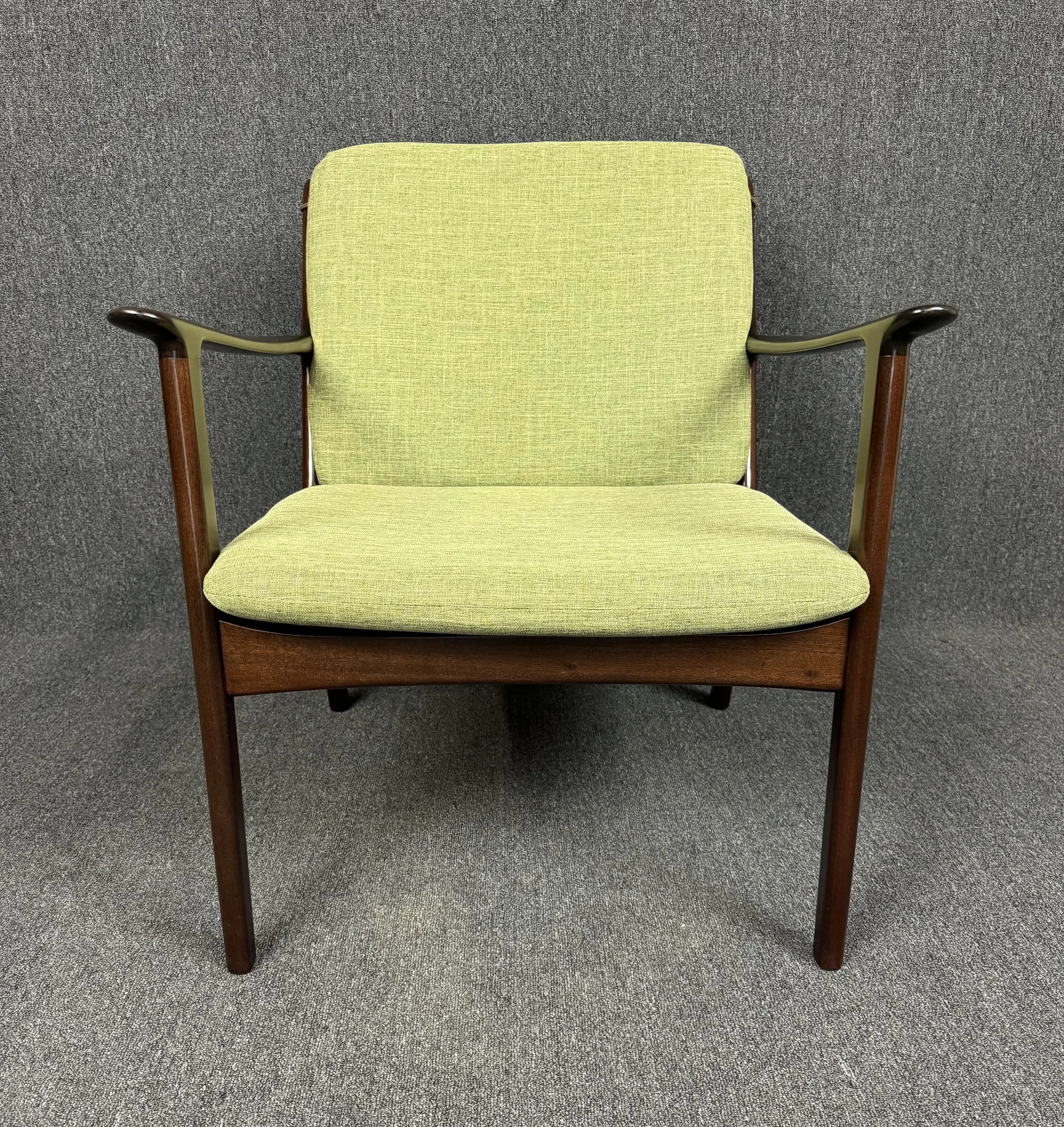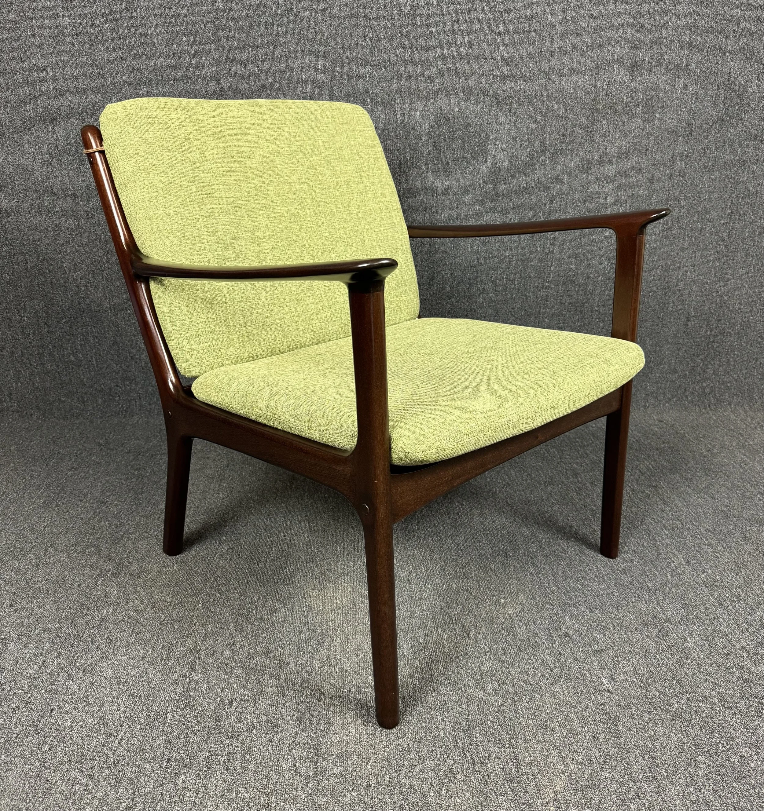 Here is beautiful Scandinavian easy chair Model PJ112 in mahogany designed by professor Ole Wanscher and manufactured by Poul Jeppesen in Denmark in the 1960s. This comfortable chair, recently imported from Copenhagen to California before its refinishing, feature a sculptural frame in solid mahogany, new foam cushions and new upholstery in contrasting period correct textured fabric in green chartreuse.