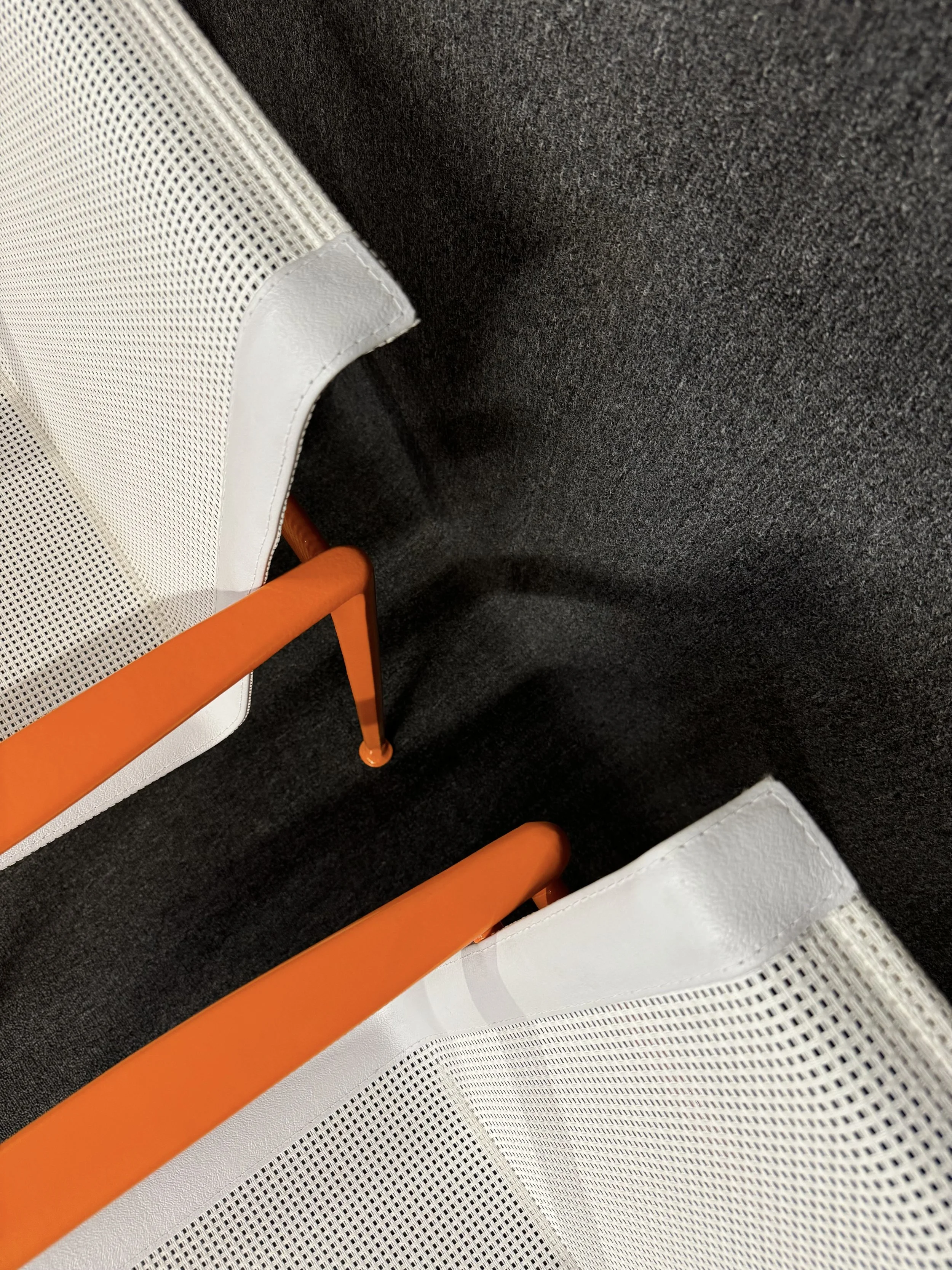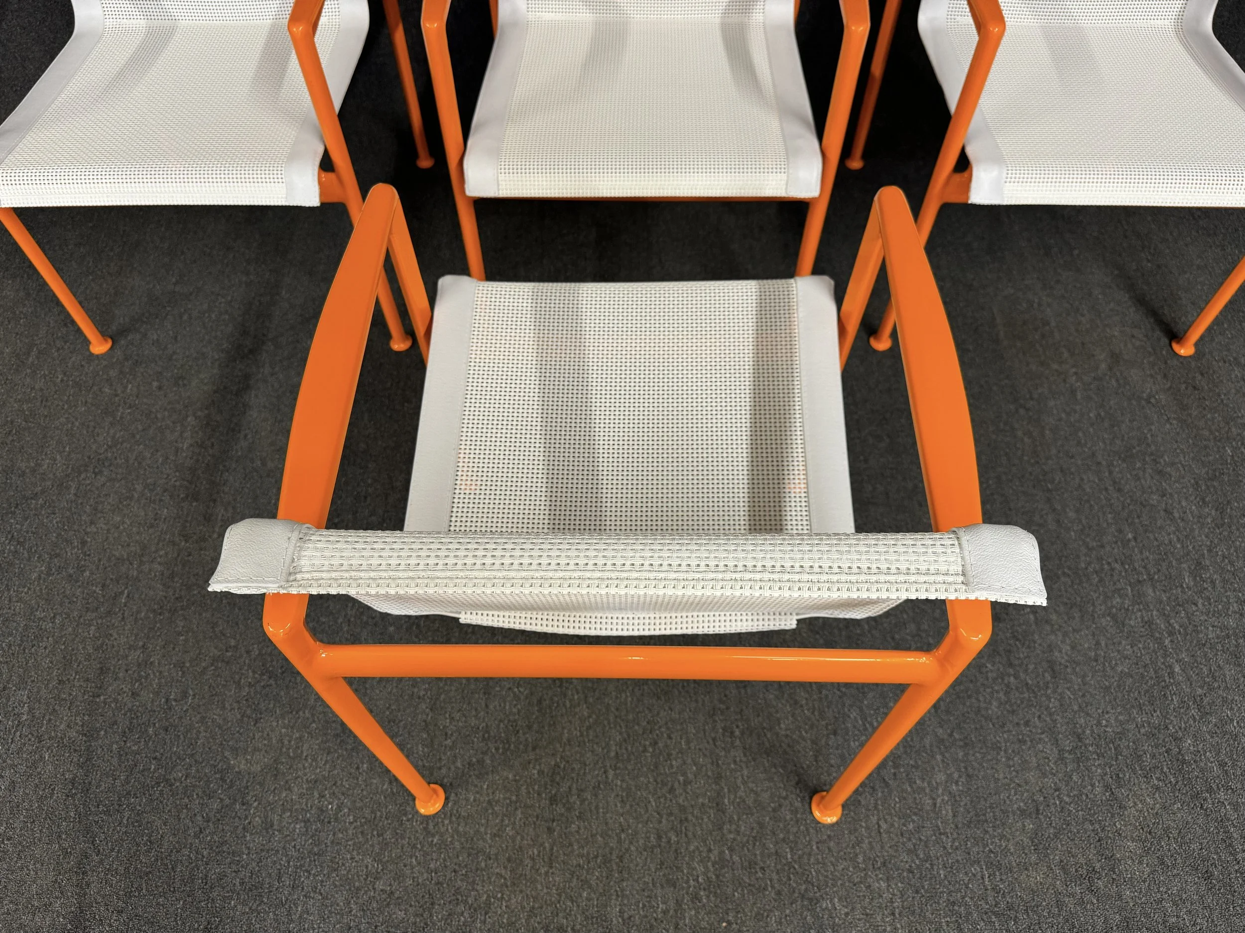 The cast aluminum frames were sand blasted, zinc primed and powder coated in orange by North County Powder Coating in September 2024.