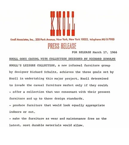 In 1966, Schultz debuted the Leisure Collection, crafted at Florence Knoll's request for her Florida home. He fondly recalled, “My editor was Mrs. Knoll.” Schultz remained at Knoll until 1973, when he left to pursue freelance design. Over the years, Knoll changed ownership multiple times, and Schultz's furniture was temporarily out of production.